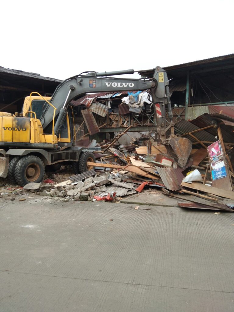 Juruketik.com – Sejumlah lapak pedagang yang berada di area Pasar Jambu Dua dibongkar. Pembongkaran bangunan semi permanen itu dengan menggunakan satu unit beko.