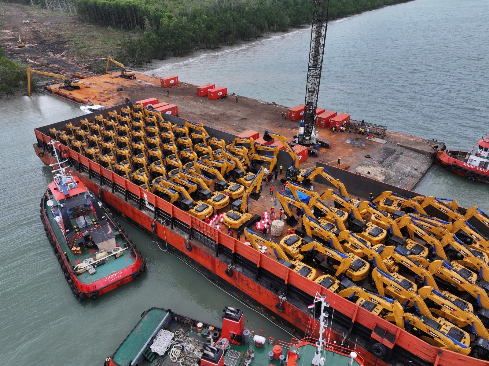 “Untuk gelombang kedua dan ketiga juga tiba Selasa malam ini juga. Masing-masing tongkang mengangkut 88 unit excavator,” jelasnya.